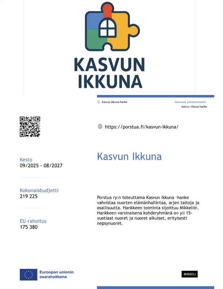 Porstua ry:n toteuttama Kasvun Ikkuna -hanke vahvistaa nuorten elämänhallintaa, arjen taitoja ja osallisuutta. Hankkeen toiminta sijoittuu Mikkeliin.